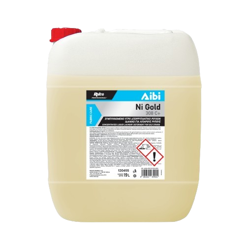Το Aibi Ni Gold 308 C+ είναι συμπυκνωμένο ουδέτερο υγρό απορρυπαντικό με οπτικά λευκαντικά, πλούσιο σε ανιονικά και μη ιονικά τασιενργά, ενώ περιέχει τερπένια πορτοκαλιού που δρουν ως φυσικοί διαλύτες.